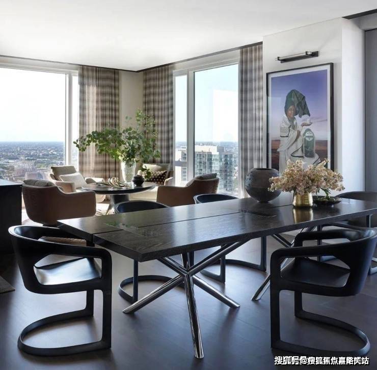 正在宽敞的落地窗边安放休闲餐桌椅,打制既高级又充满梦幻感的居家空间.因为公居所属精英社区,卧室内的安排以现代设想为从,但地面鹅绒的地毯、柔嫩的床单和复古的吊灯。